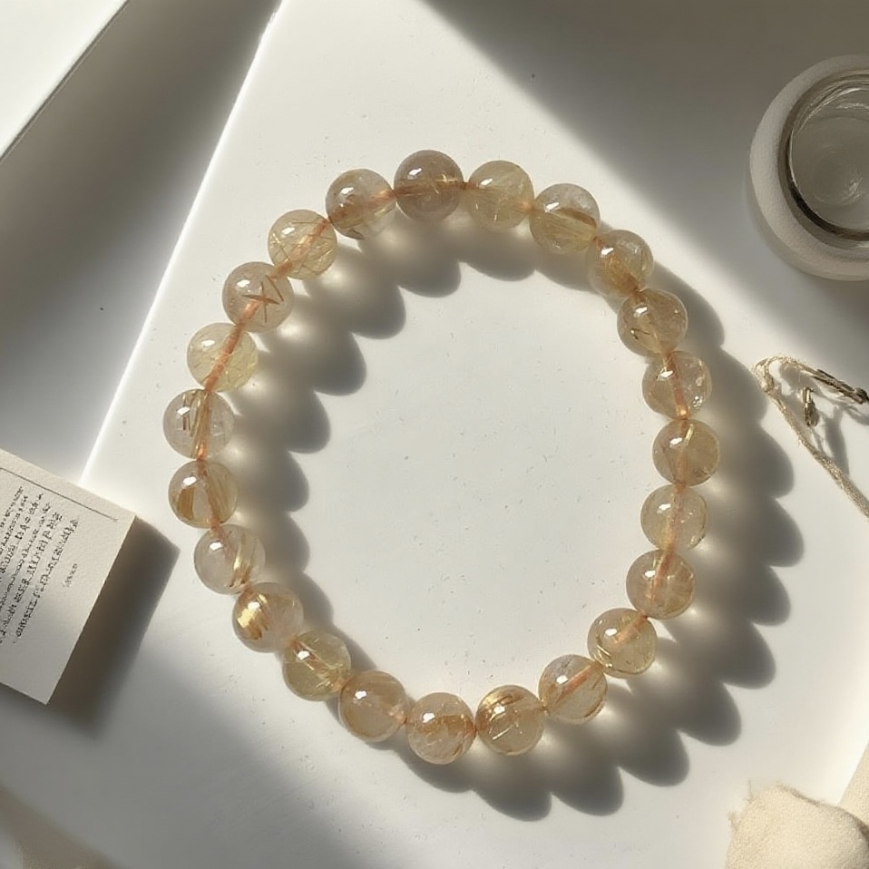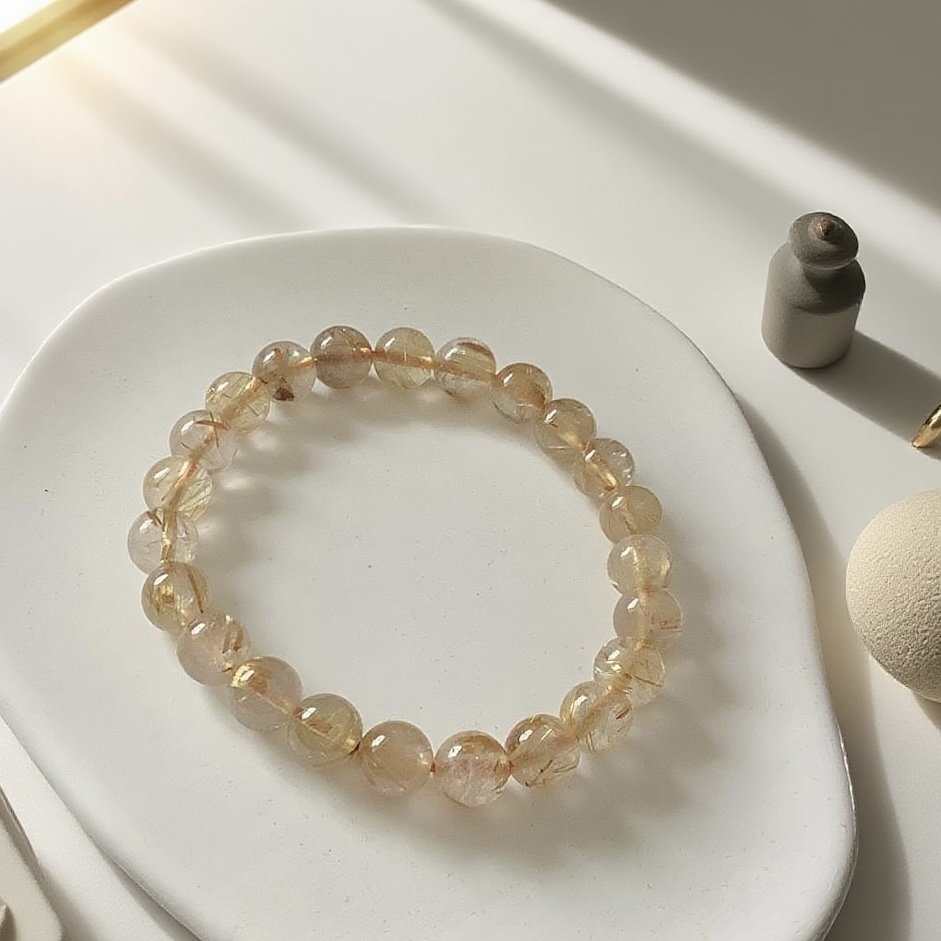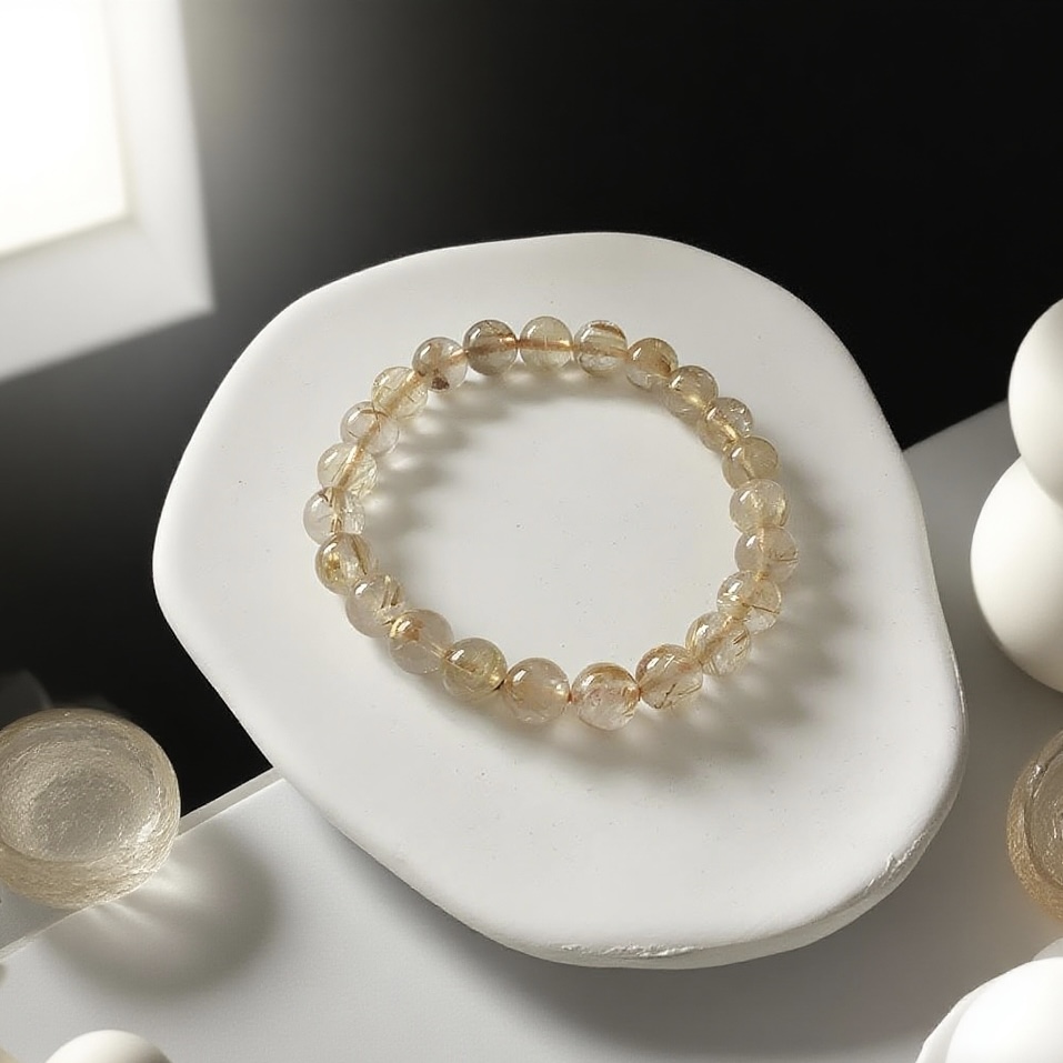 This bracelet features 6mm golden rutilated quartz beads, showcasing eye – catching golden rutile inclusions. Strung on an elastic cord for a comfortable fit, it’s a stylish accessory that connects to the solar plexus chakra, boosting confidence and positive energy.