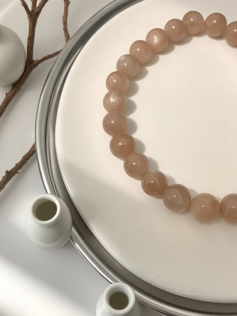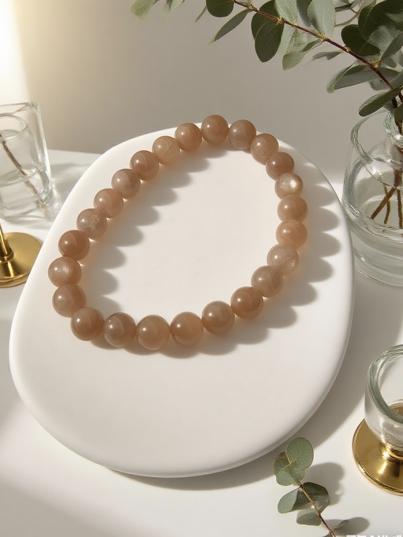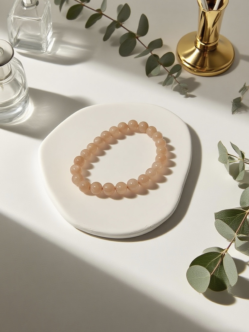 This bracelet features 6mm peach moonstone beads with a soft, peachy glow. Strung on an elastic cord, it’s a gentle accessory that connects to the heart chakra, promoting love, emotional healing, and inner warmth.